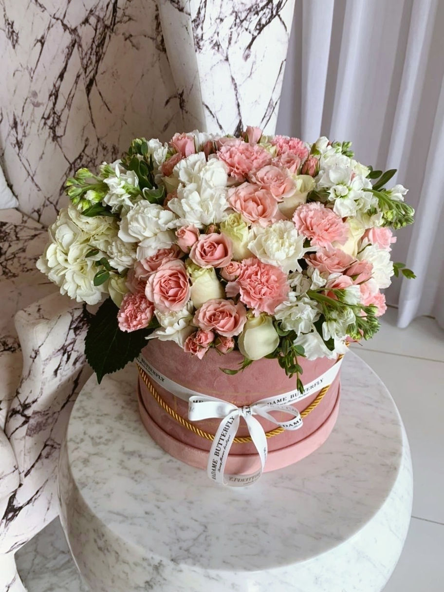 Les presentamos nuestra caja redonda "Lux Velvet" en rosa ahumado o gris, adornada con una hermosa composición de flores en tonos rosa claro o morado claro. Este arreglo incluye una encantadora mezcla de rosas, rosas arbustivas, estatice, matthiola y claveles. Ten en cuenta que las flores específicas pueden variar según la disponibilidad. Elige tu color preferido a continuación, y nuestro equipo de diseñadores creará un arreglo inolvidable para tu día especial. Adecuado para todas las ocasiones, desde cumpleaños hasta baby showers y aniversarios.
