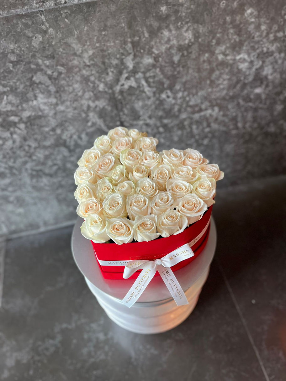 "LUX Heart Red” flower box with 25 roses is the epitome of elegance and luxury. The exquisite velvet material of the box enhances the sophistication of each rose, creating a unique visual experience. This gift is not just a bouquet; it's a statement. Roses, with their timeless beauty, symbolize love, tenderness, and admiration.