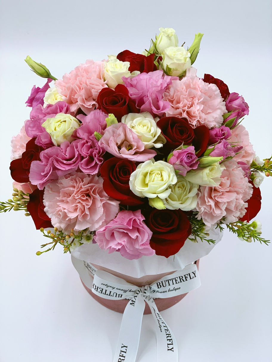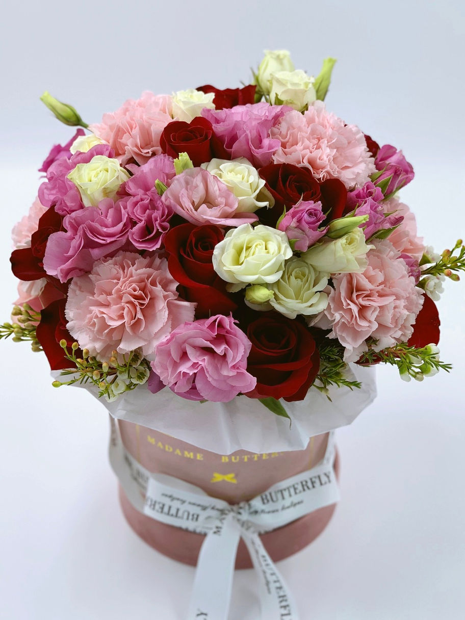 Introducing our Mini Box in Navy Blue, Light Pink, Blue, or Burgundy (size 16 cm * 15 cm), adorned with a colorful flower composition consisting of roses, shrub roses, lisianthus, carnations and eucalyptus. This arrangement is a perfect blend of elegance and charm, ideal for any celebration from birthdays to baby showers or anniversaries. Please note that specific flowers may vary based on availability. Choose your preferred color below, and our team of designers will craft an unforgettable arrangement for your special day.